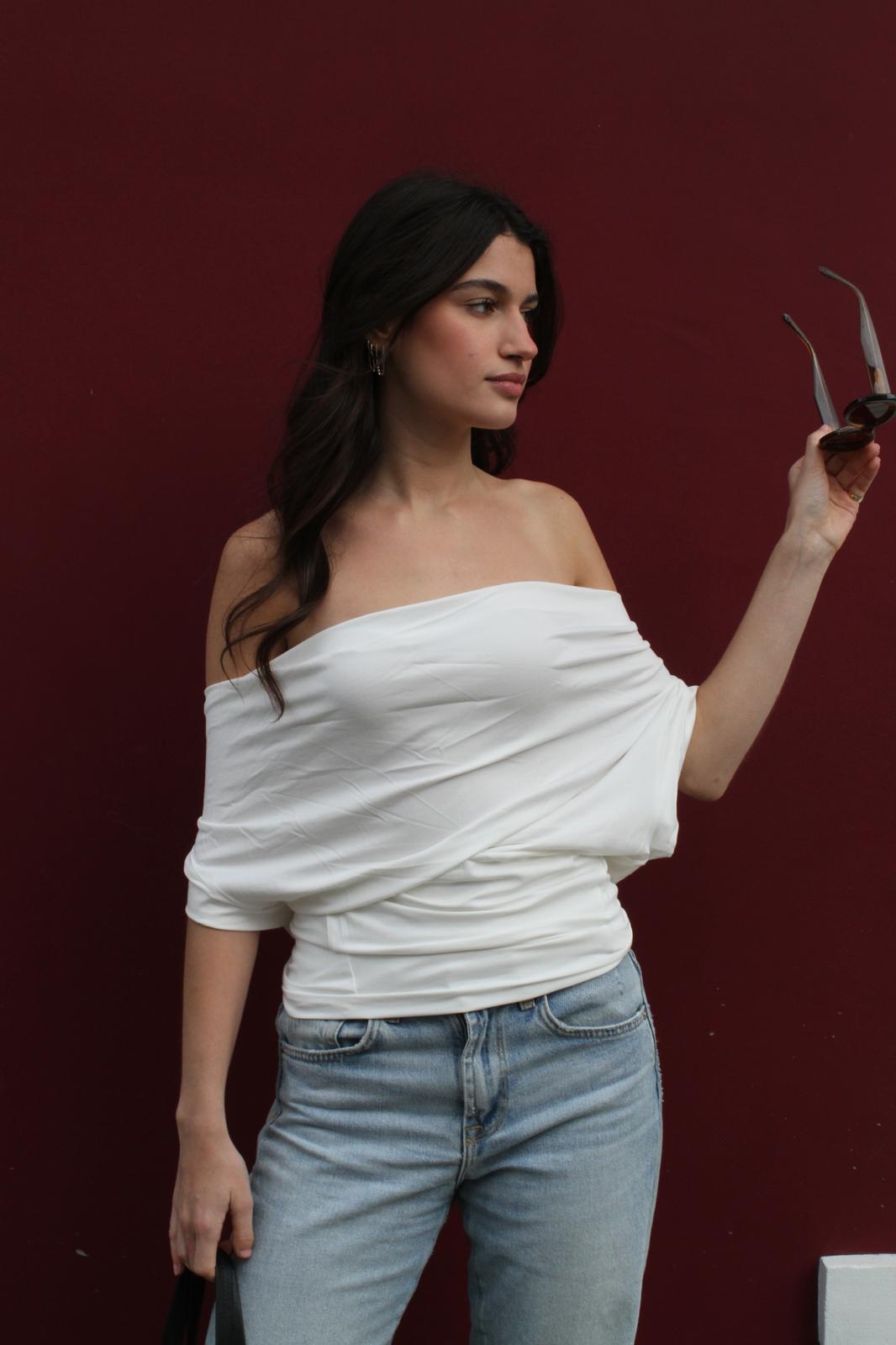 The Charo top, crafted from soft, buttery viscose, features a wide draped neckline that can be styled off-the-shoulder, as a cowl neck, one-shoulder, or in your own unique way. Designed as one size, it fits small to large best.
